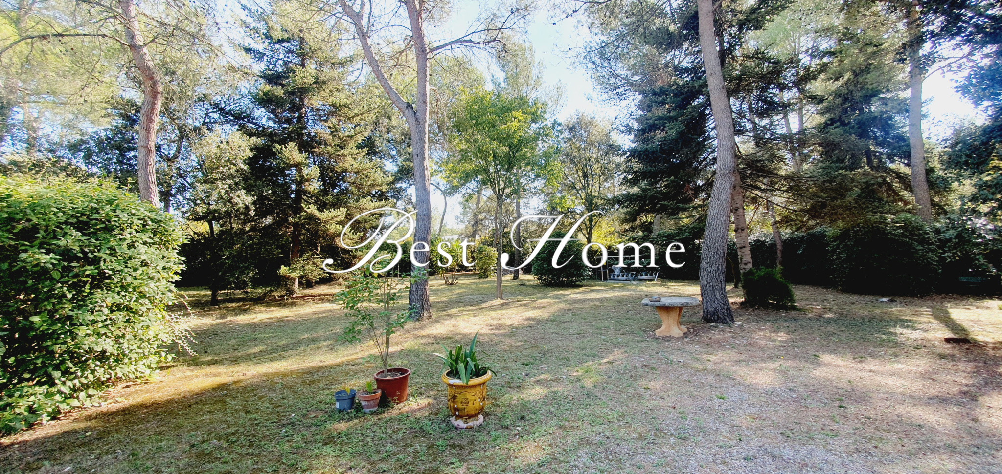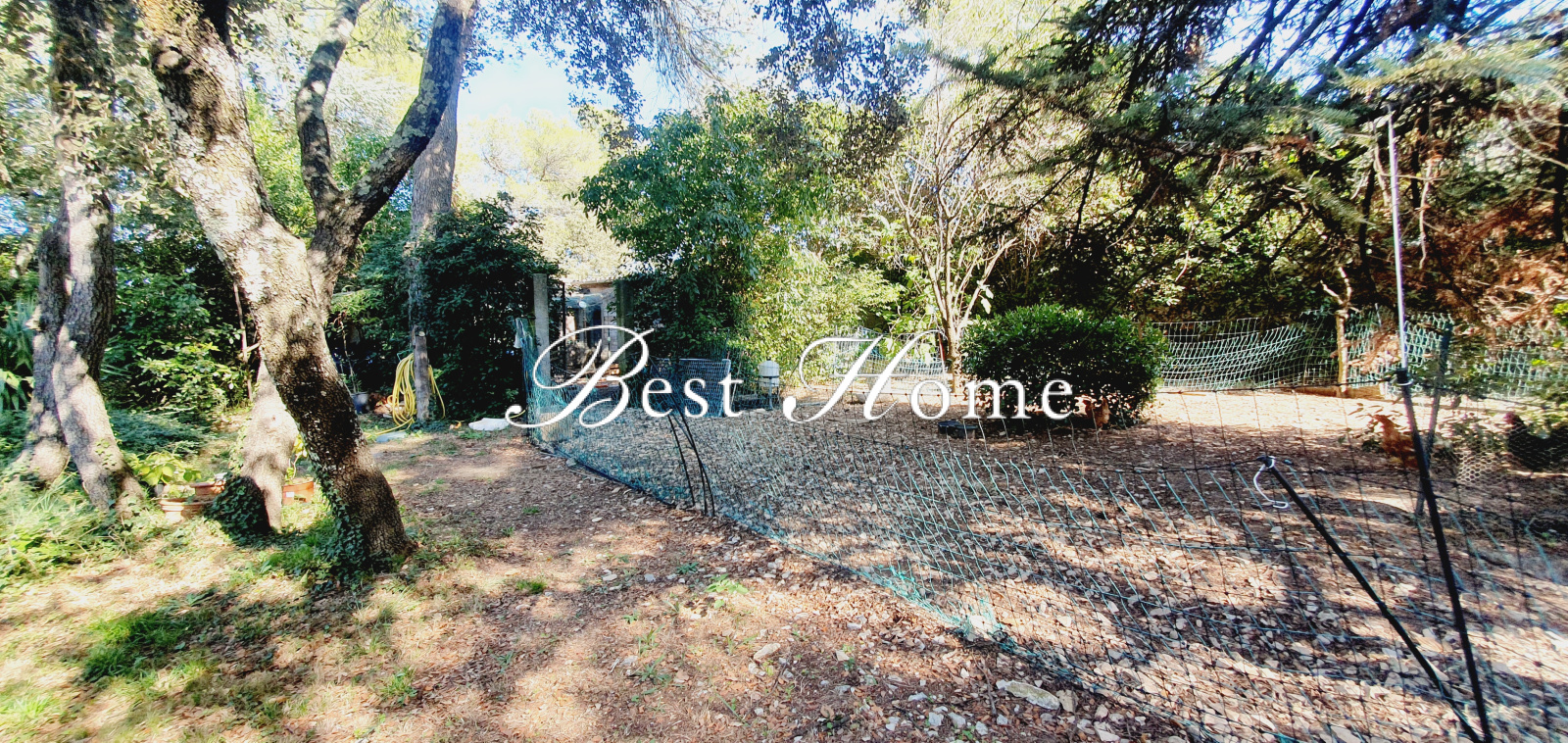 Le terrain de 3000 m² clos est arboré avec oliviers, pins, chênes, cèdres pour un côté nature et garrigues.