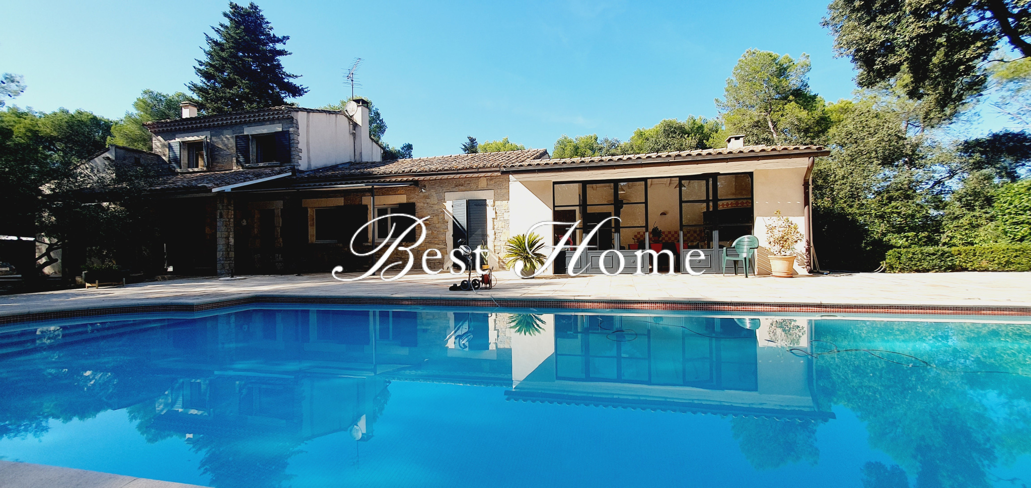 Nîmes (30000)Sur les Hauteurs de Nîmes, Best Home vous présente en Nouveauté cette Villa de charme de 154 m² habitables en parfait état. Elle se compose d'un hall avec toilettes indépendant, une belle cuisine avec plan de travail en granit, vue sur la spacieuse terrasse qui se déroule devant la maison et qui borde la piscine, une belle pièce de vie de 51 m² permet d'accueillir les convivent et la cheminée avec insert en pierre de Vers complète la pièce, les ouvertures permettent de rejoindre la terrasse, l'exposition est sud-ouest lui confère un ensoleillement maximal. Un premier cellier de 4 m², puis un second avec la buanderie de 17 m², une suite parentale de 16 m² avec accès sur terrasse et vue piscine, un dressing 4,2 m² et une salle d'eau avec toilettes suspendus douche italienne de 6 m² complète l’ensemble. L'étage offre une chambre ou bureau de 8,2 m², une chambre de 15,6 m² avec plafond cathédrale, une salle d'eau avec toilettes 2,1 m². Le terrain est entièrement clos et arboré, magnifique pool house de 27 m² (avec toilettes, eau, électricité, BBQ) grande baie en fer forgé ouvrant au sud sur la terrasse avec piscine. Le garage de 28 m² avec mezzanine et car-port pouvant abriter deux véhicules, une serre.